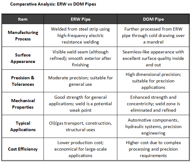 DOM pipes focus on precision and strength. They are better suited for high-performance and safety-critical parts.