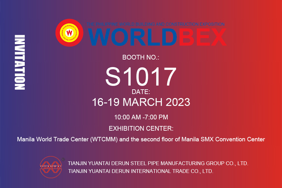Tianjin Yuantai Derun Steel Pipe Manufacturing Group will exhibit our main products, such as square steel pipe, galvanized steel pipe, straight seam steel pipe, pipeline pipe, scaffold steel pipe, magnesium aluminum-zinc plated steel pipe, seamless steel pipe,GI coil,PPGI coil,steel coil etc.
