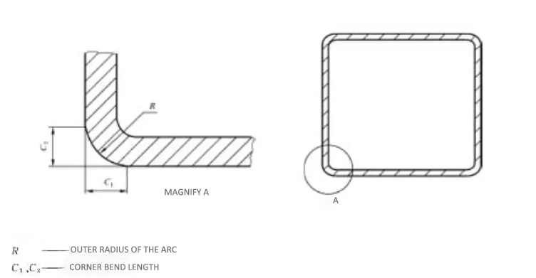 The R angle refers to the radius of the outer corner arc of a square or rectangular steel pipe.