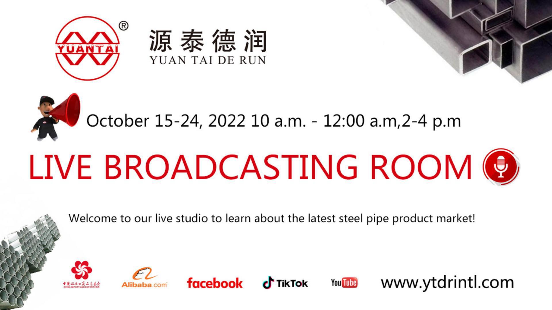 Kennisgewing! Kennisgewing! Tianjin Yuantai Derun Steel Pipe Manufacturing Group sal van 15 Oktober tot 24 Oktober 2022 aan die 132ste Canton Fair deelneem. Hulle sal kopers regoor die wêreld ontmoet in die vorm van aanlyn regstreekse uitsending, en verwelkom almal hartlik om deel te neem aan bespreking en interaksie in die regstreekse uitsendingsaal.